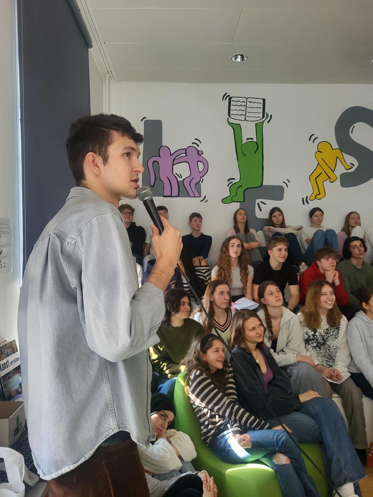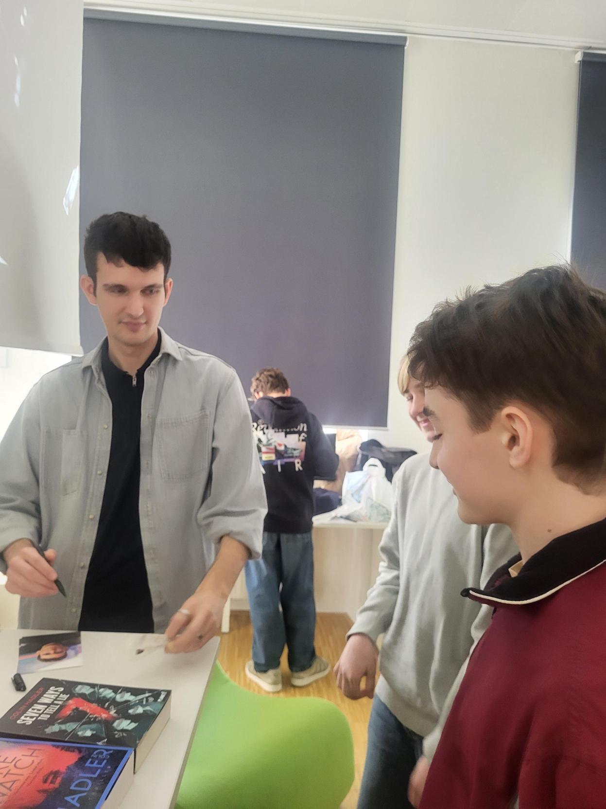 Der Jugendbuchautor Colin Hadler, der neuerdings auch für Erwachsene schreibt - sein Thriller „Fire Watch“ ist in unserer Bibliothek verfügbar! - war neuerdings zu Gast in unserer Bibliothek. Nicht zum ersten und sicher nicht zum letzten Mal. Denn wenn es einen gibt, der schreibt UND lässig, cool und witzig ist, dann ist das dieser junge Mann. Sein Lesekabarett zum Jugendthriller „Seven Ways to Tell a Lie“ bot alles, was Spaß macht: Galgenhumor, Selbstironie und die Freude an der kleinen Grenzüberschreitung. Colin? Cool!!!