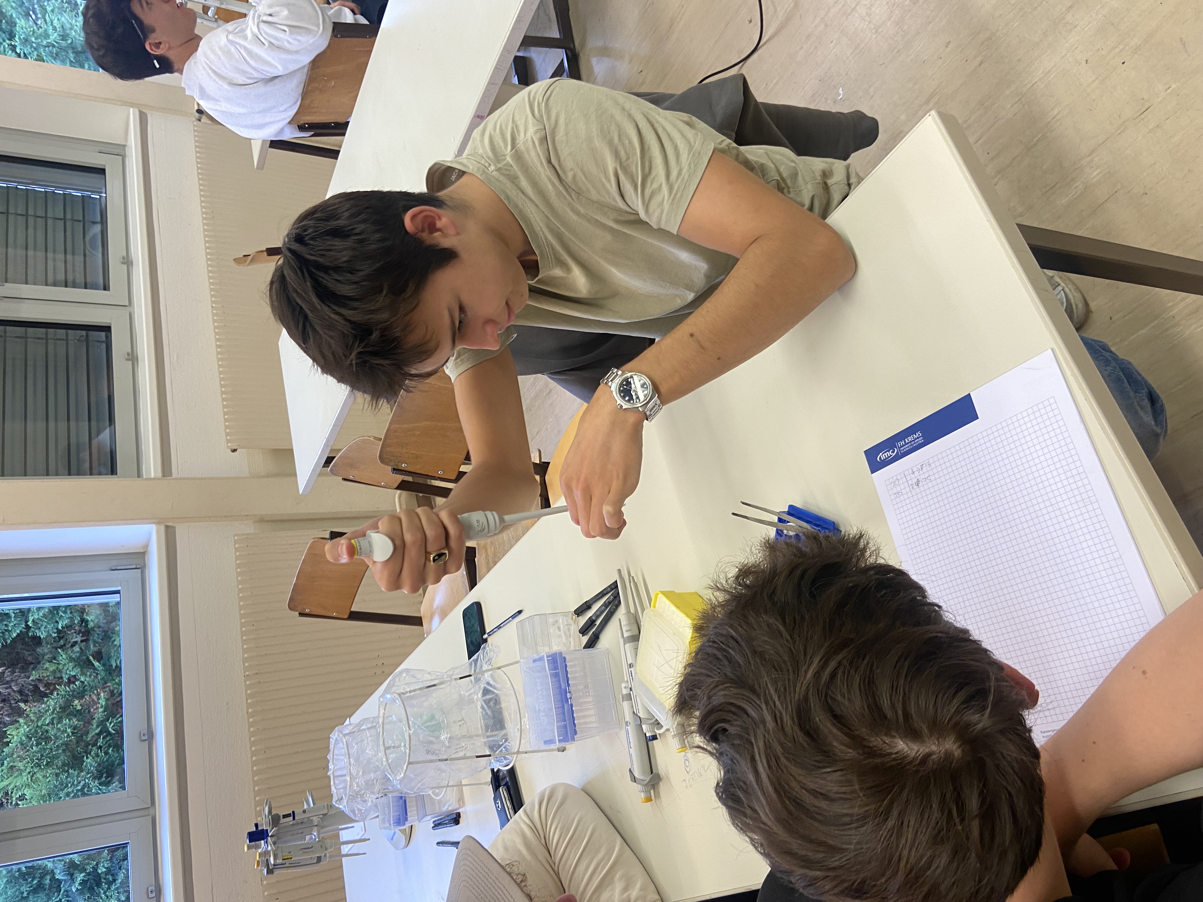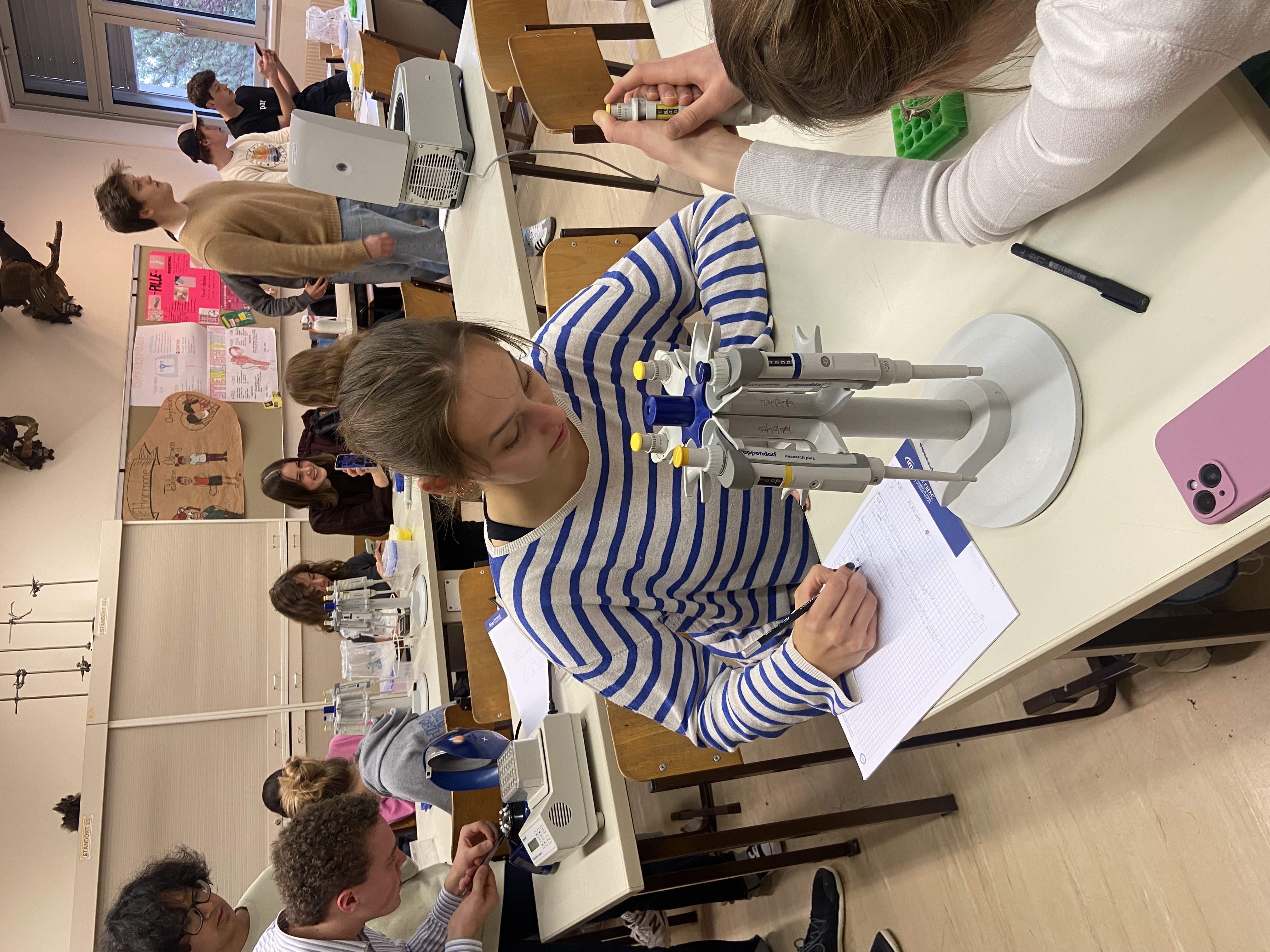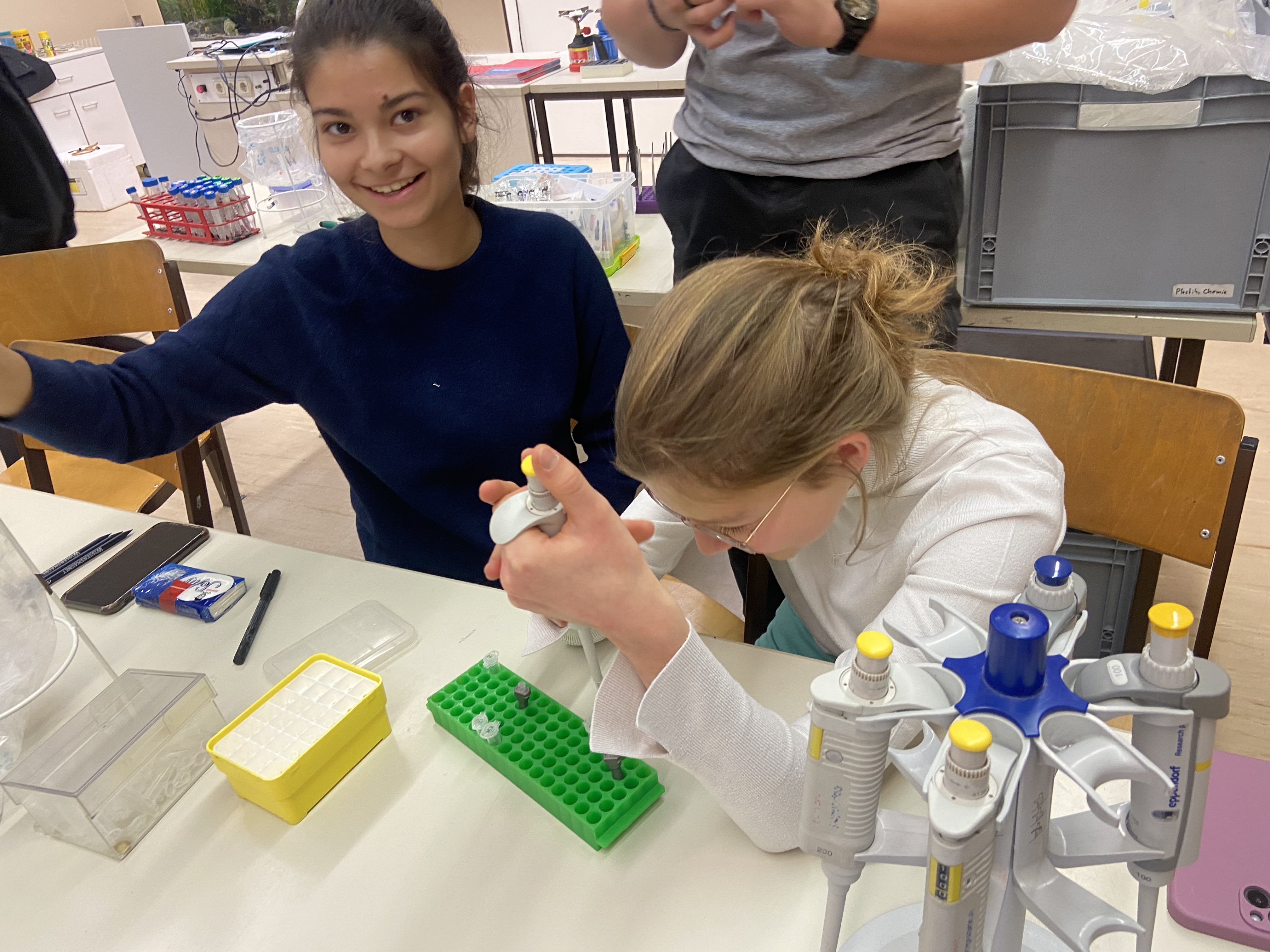 Vor der eigentlichen Arbeit starteten wir mit ein paar Übungen zum Pipettieren, Mischen und Zentrifugieren. Die nötigen Materialien wurden uns dafür gruppenweise zur Verfügung gestellt. So lernten wir beispielsweise den richtigen Umgang mit einer Pipette und die Wichtigkeit von sauberem und genauem Arbeiten. Danach ging es mit der „richtigen“ Arbeit weiter.