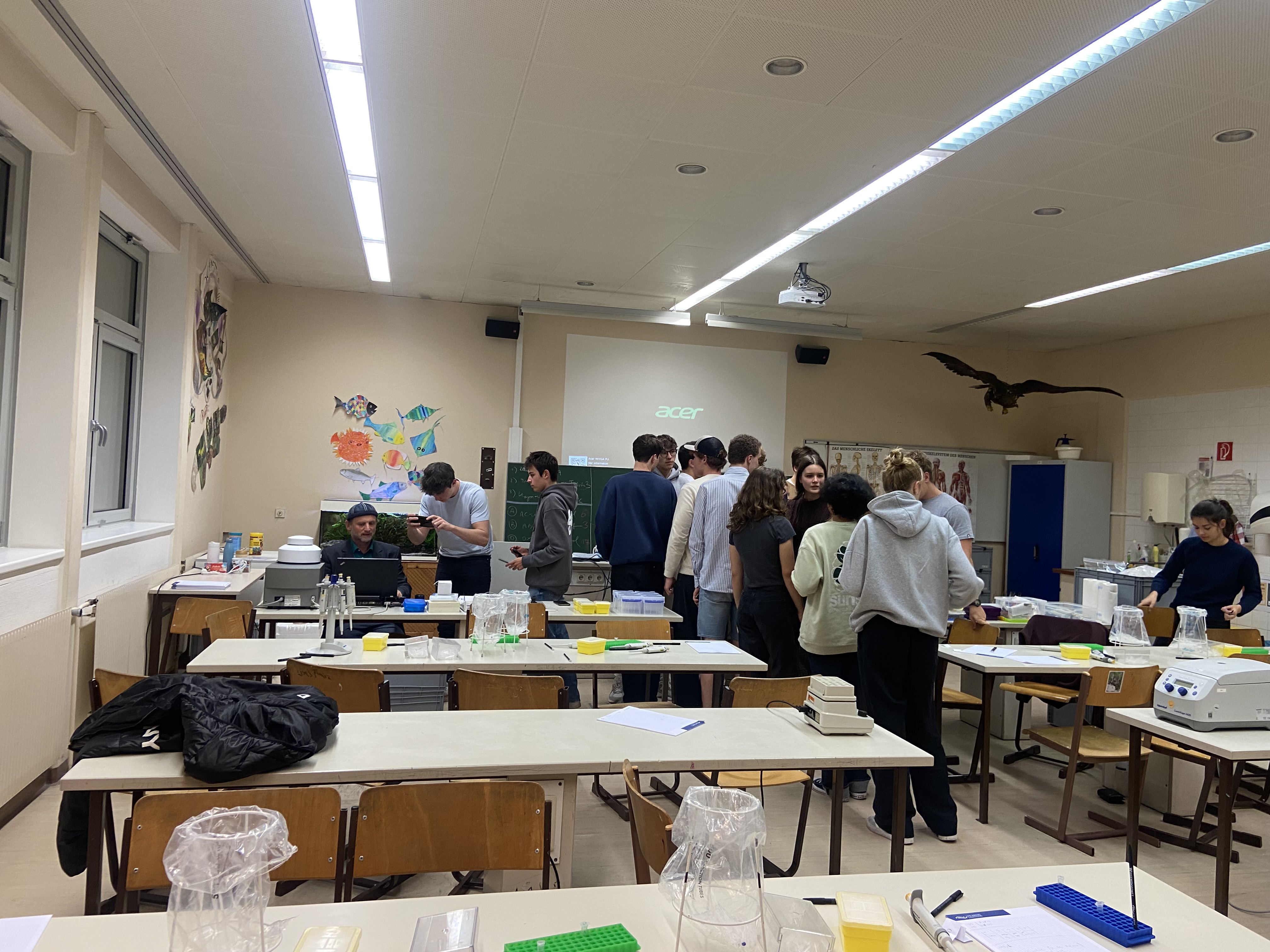 Der Labortag startete für uns um 8 Uhr im Biologiesaal, der für den Kurs zu einem Labor umgestaltet wurde. In einer kurzen Einleitung bekamen wir einen Überblick, wie der Tag verlaufen sollte. Am Ende des Tages sollten wir alle die Möglichkeit bekommen, unsere DNA zu untersuchen. Genauer gesagt durften wir zwischen drei Genen wählen, um sie genauer zu analysieren.