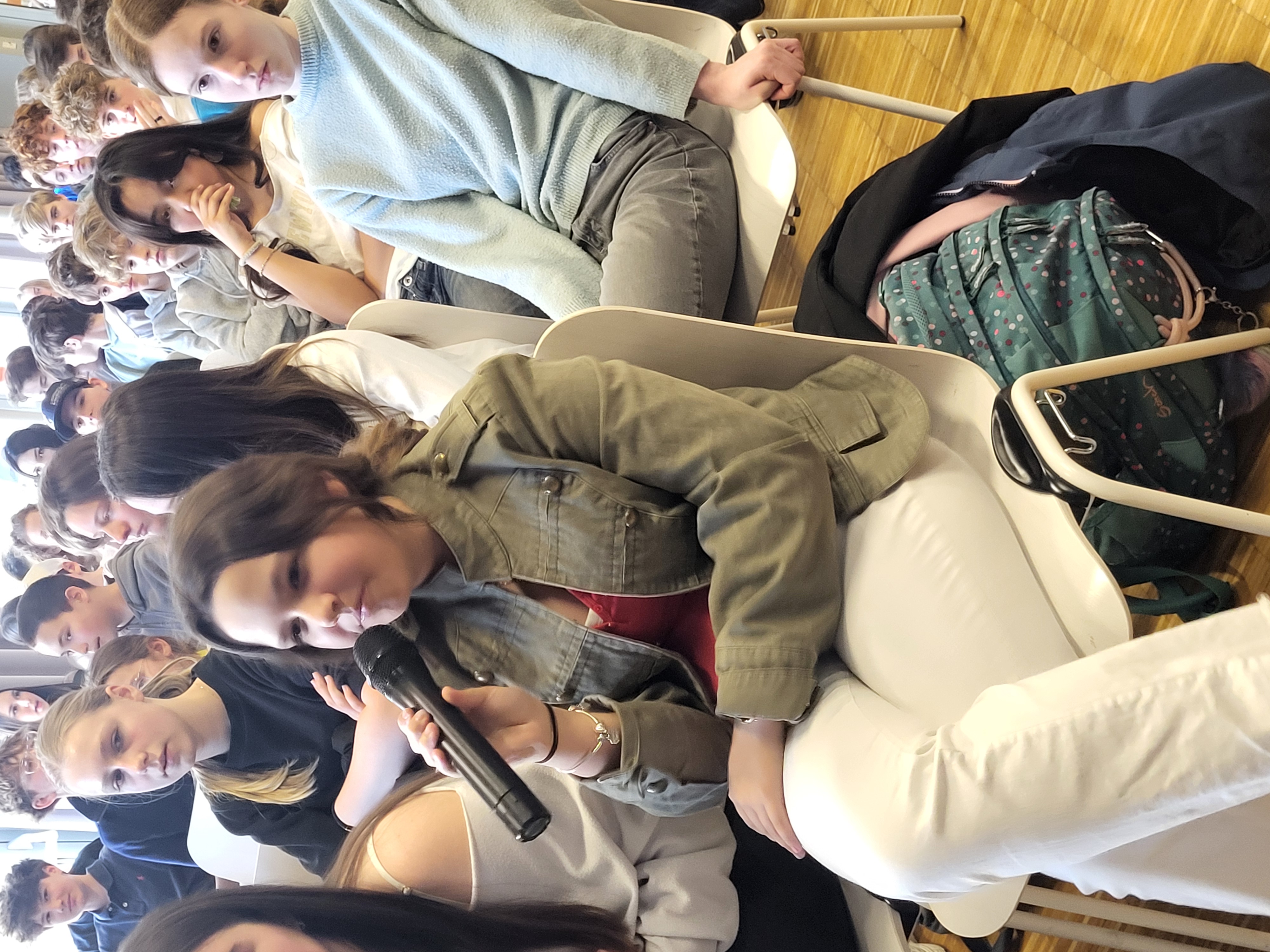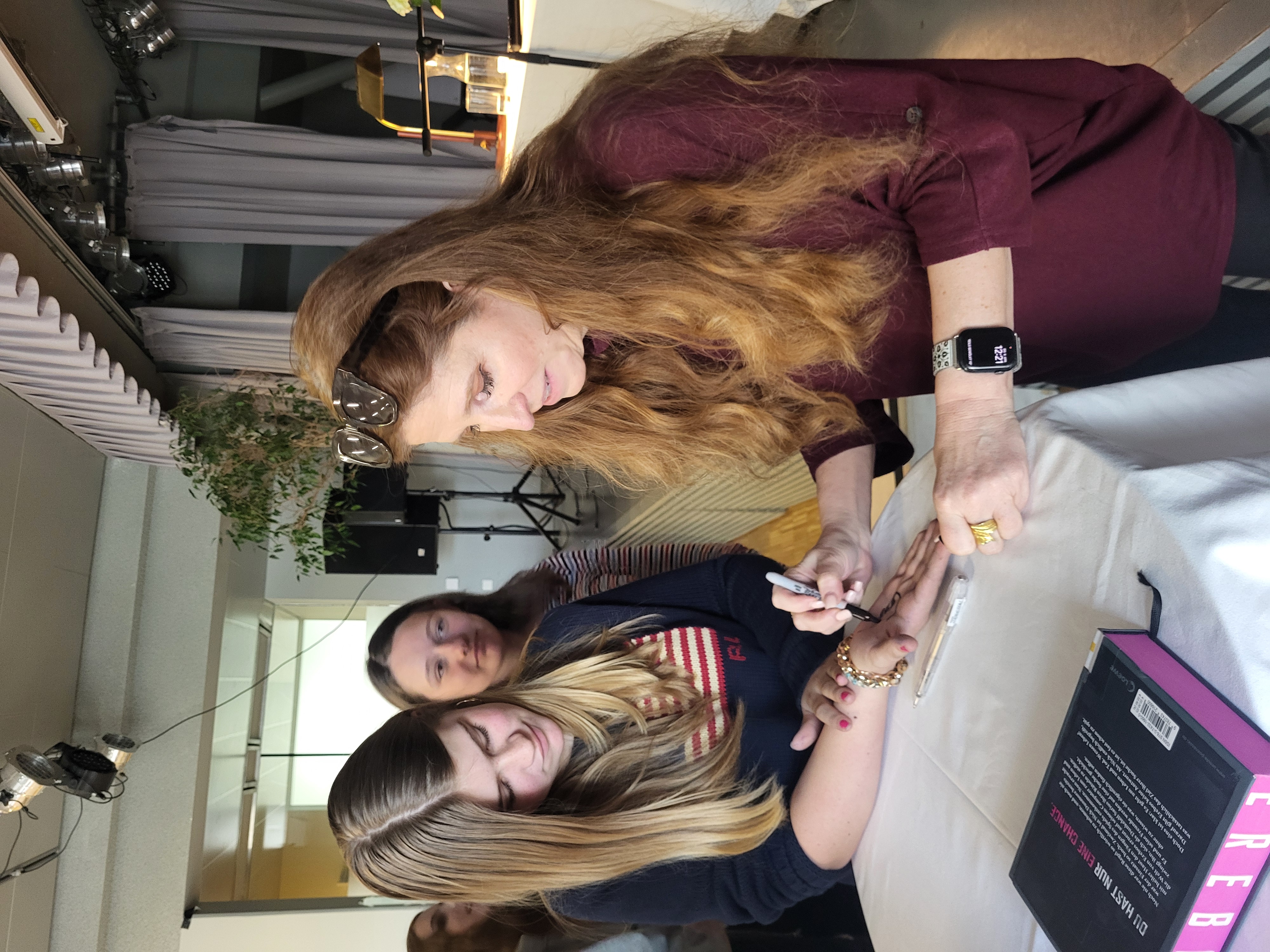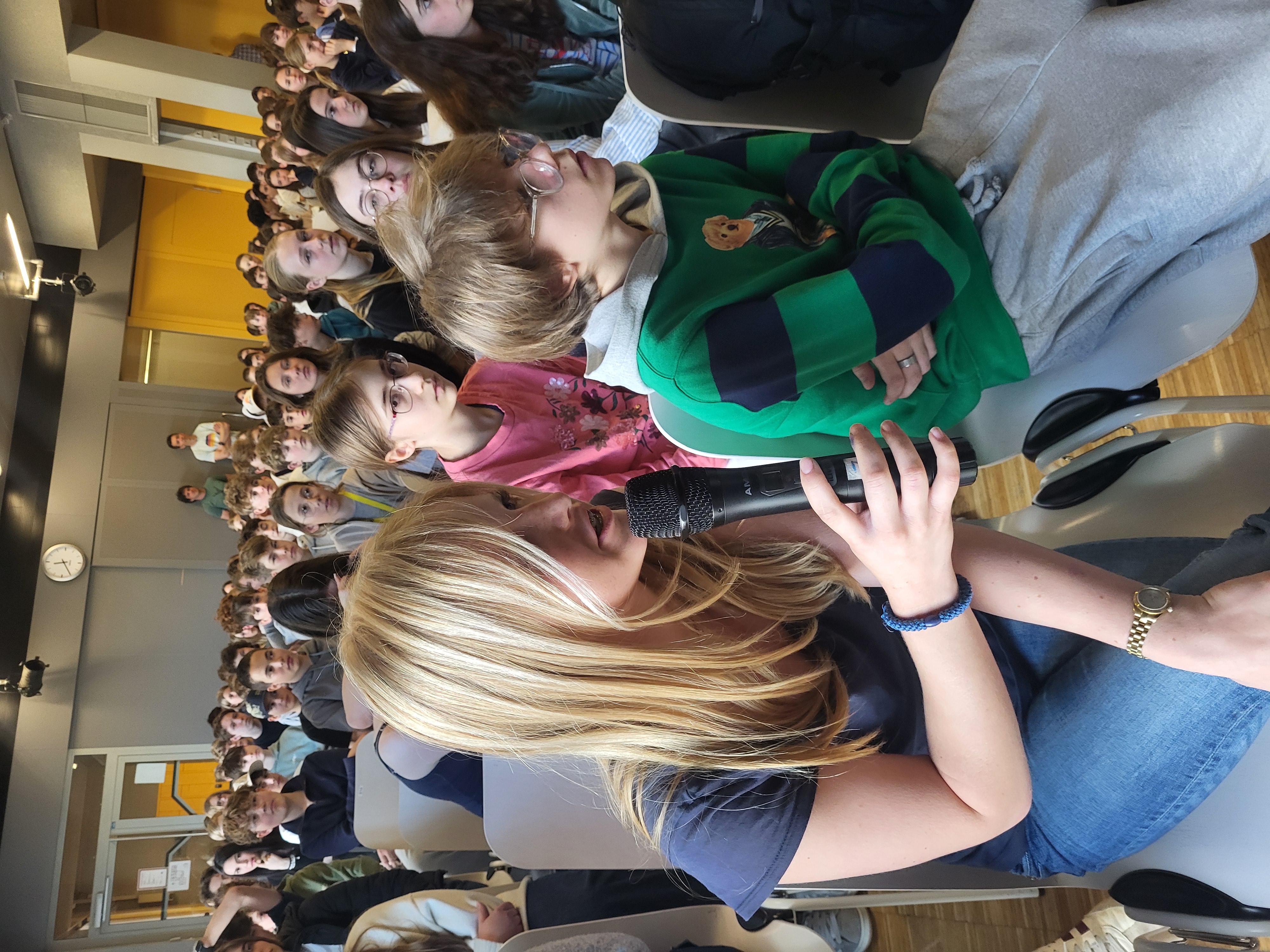 Neun Klassen, darunter einige echte Poznanski-Fans, und viele interessierte Lehrer*innen kamen, um der Fortsetzung der Geschichte rund um Nick Dunmore alias Sarius, dem Dunkelelf, zu lauschen. Danach plauderte die Autorin noch aus dem schriftstellerischen Nähkästchen, verriet etwa auf die Fragen aus dem Publikum, wie es möglich ist, jedes Jahr zwei Bücher zu verfassen, wie viel sie pro verkauftem Exemplar verdient und wem die Widmung „Für Leon“ in Erebos gilt. Am Ende gab es noch eine Signier-Viertelstunde, wobei nicht nur Bücher, sondern auch allerlei mit Unterschrift versehene Arme und Hände gesichtet wurden.