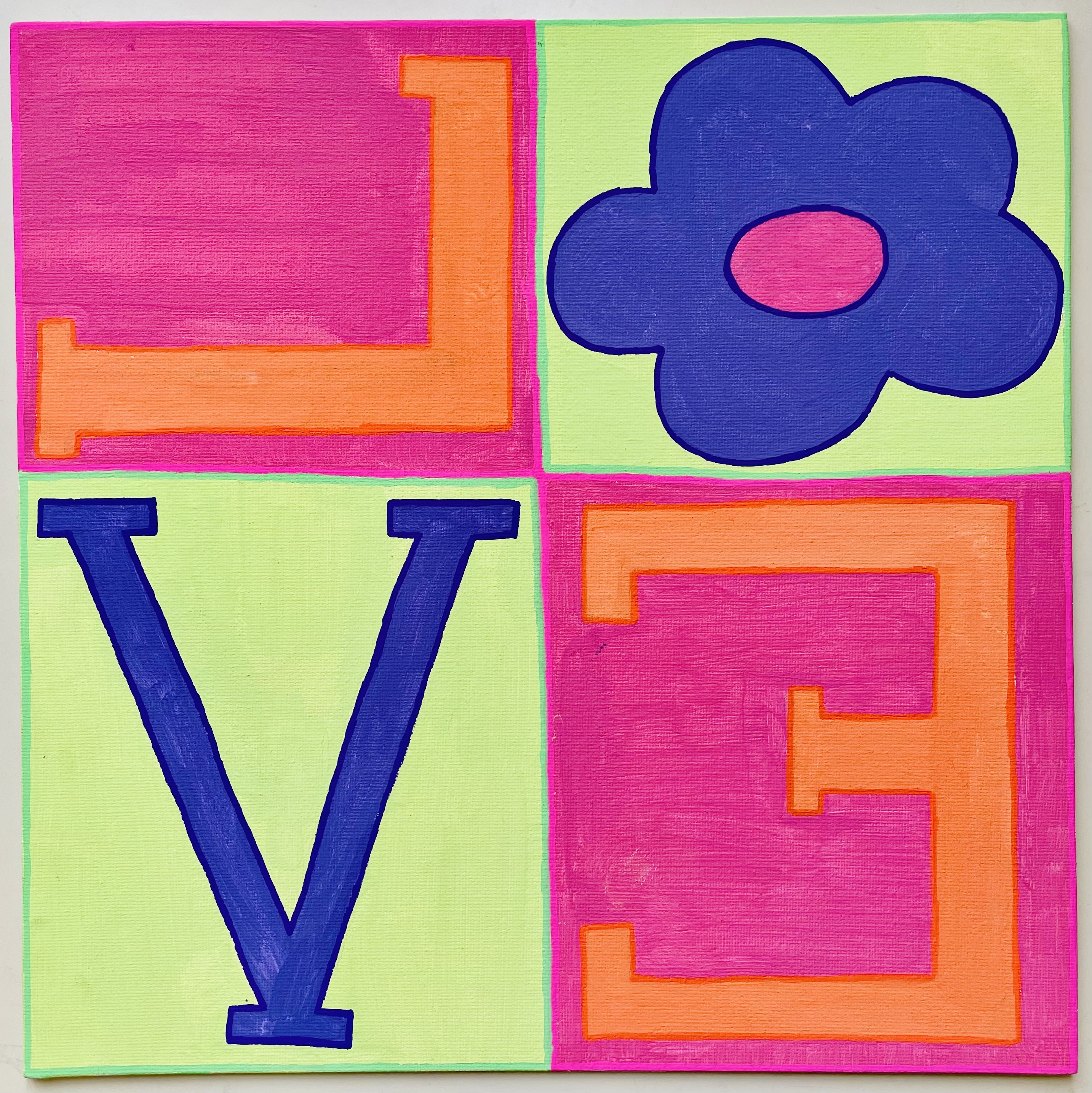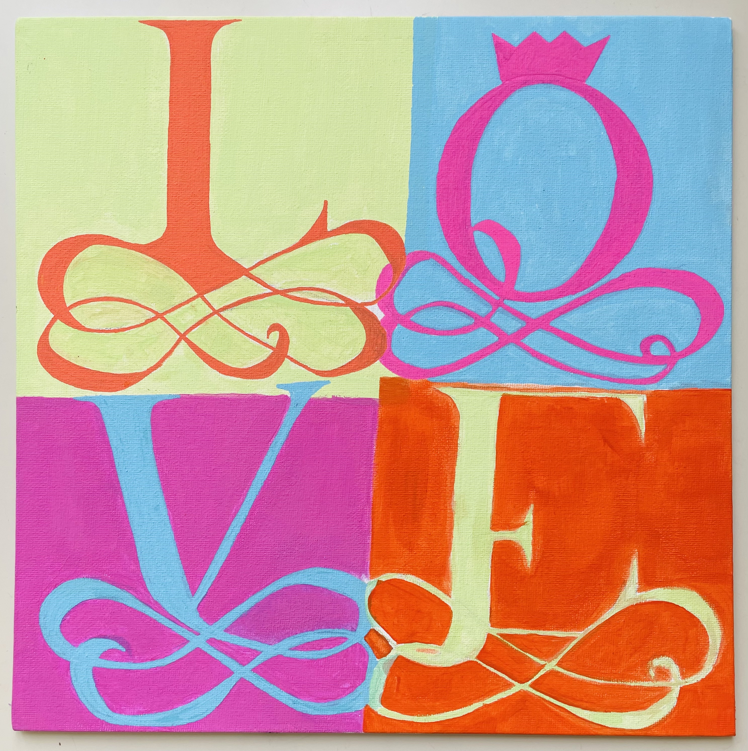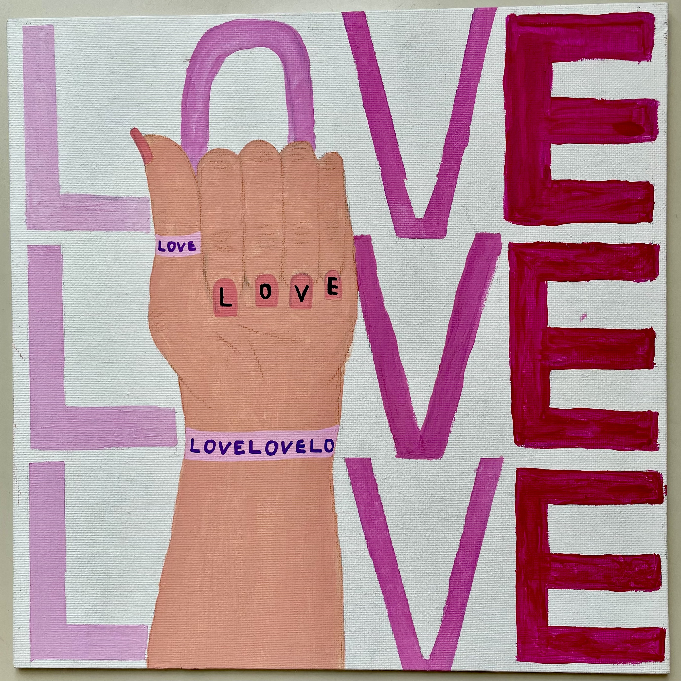 The inspiration for the students' works in class 4C, was the work of Robert Indiana/Pop-Art, and especially his work LOVE (1966). The students' works are contemporary reinterpretations of the work with acrylic on painting panels.