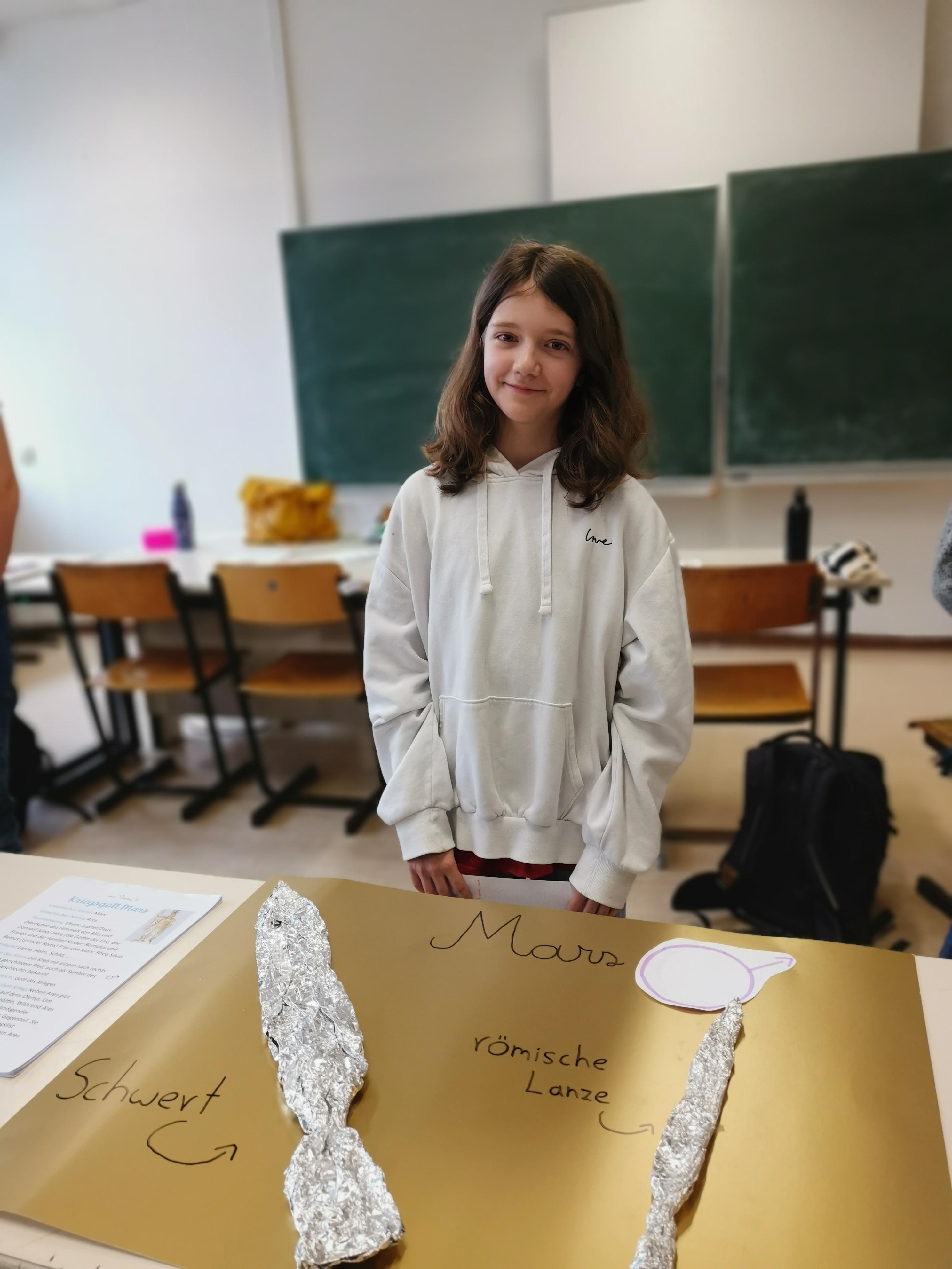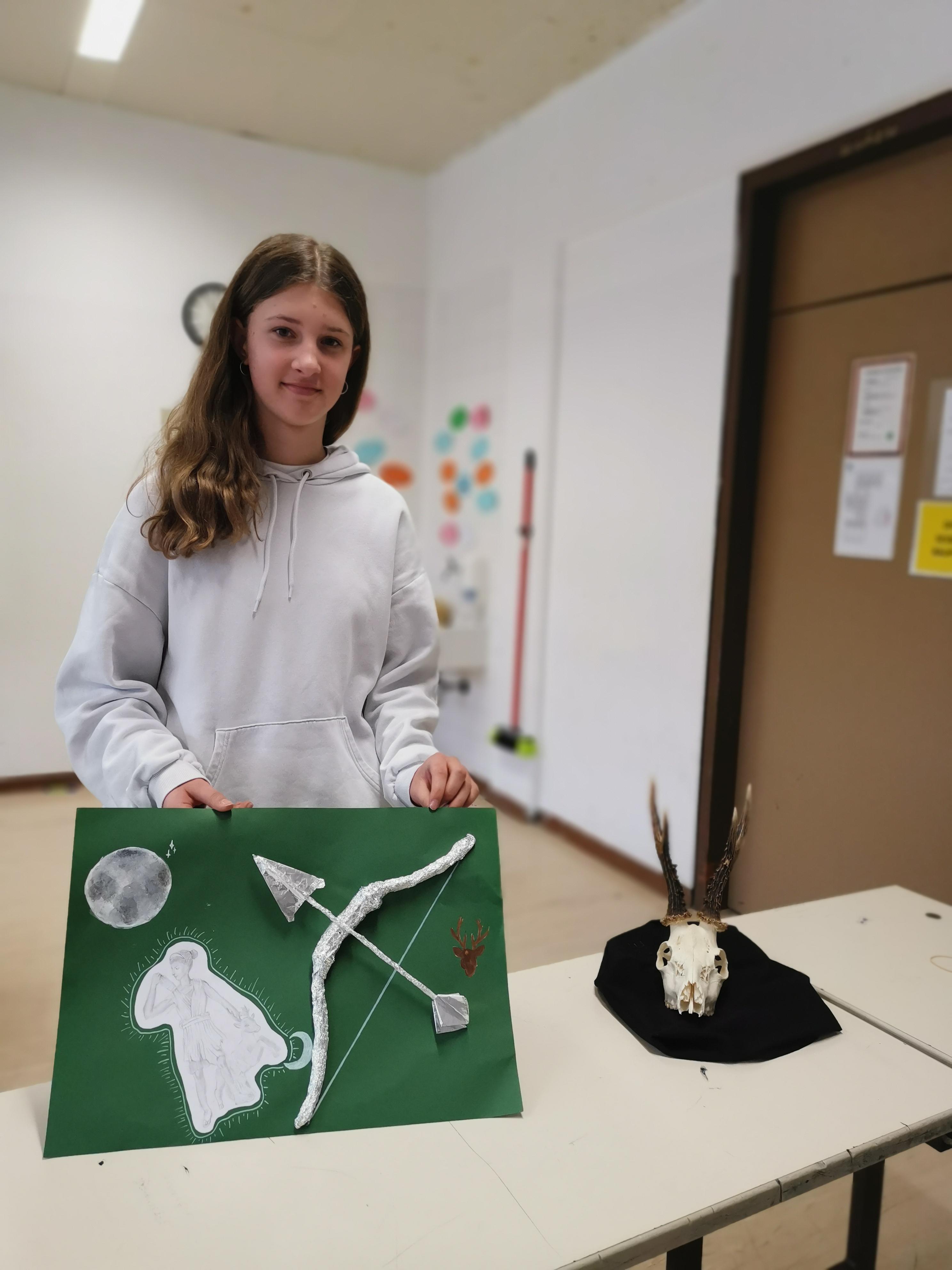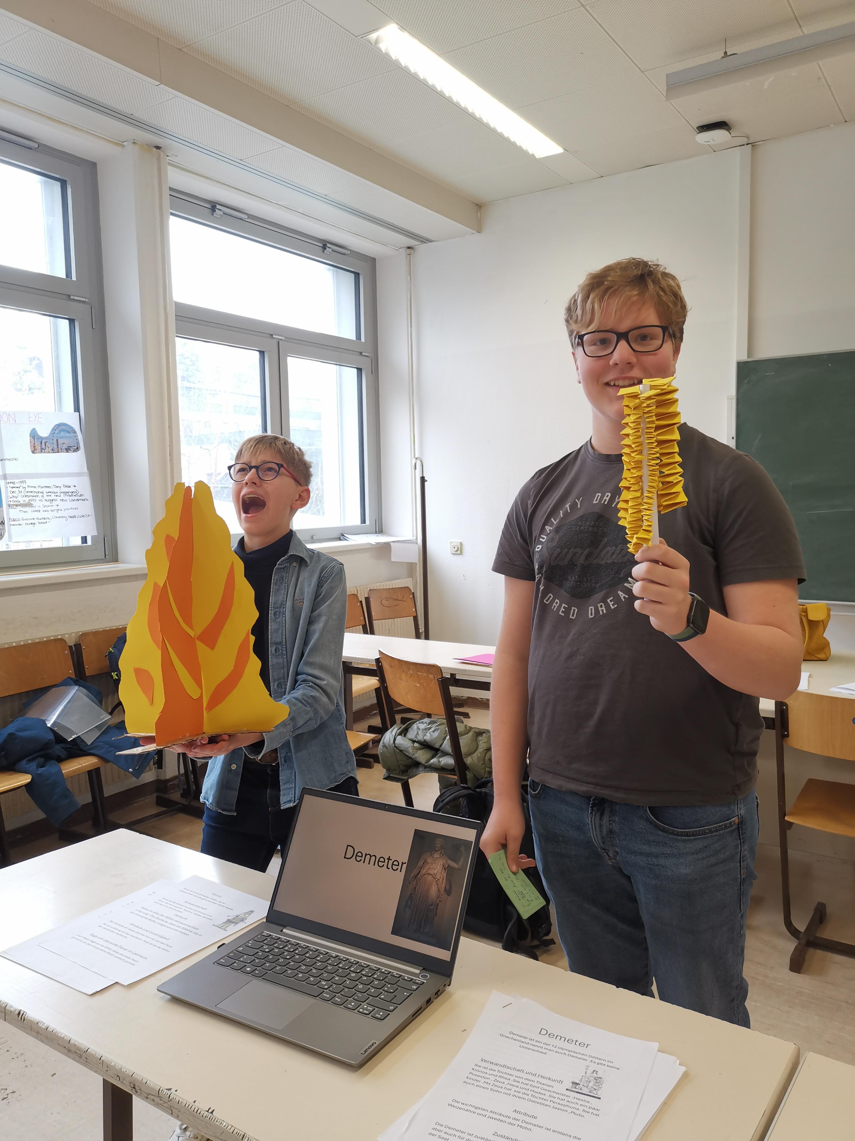 In Partnerarbeit haben sie einen Museumsbesuch der anderen/antiken Artvorbereitet. Ein sehr wichtiger Teil der Präsentation war ein Artefakt zur Gottheit, das herzustellen für alle wohl am lustigsten war. Da gab es nun beflügelnde Schuhe des Hermes/Merkur, einen riesigen Aesculap-Stab mit Schlange, ein beeindruckendes Dionysos/Bacchus-Flaschen-Etikett und Weintrauben, Poseidons/Neptuns Dreizack, einen wunderschönen Tempel, Apollos Lyra, Hammer und Amboss des Hephaistos/Vulcanus, ein Hirsch-Geweih, das Aktaion (Opfer der Artemis/Diana) symbolisiert, jede Menge Herzen der Aphrodite/Venus, einen Webstuhl der Minerva und viele weitere tolle Kunstwerke. Außerdem wollte Neptun/Poseidon unbedingt on stage!