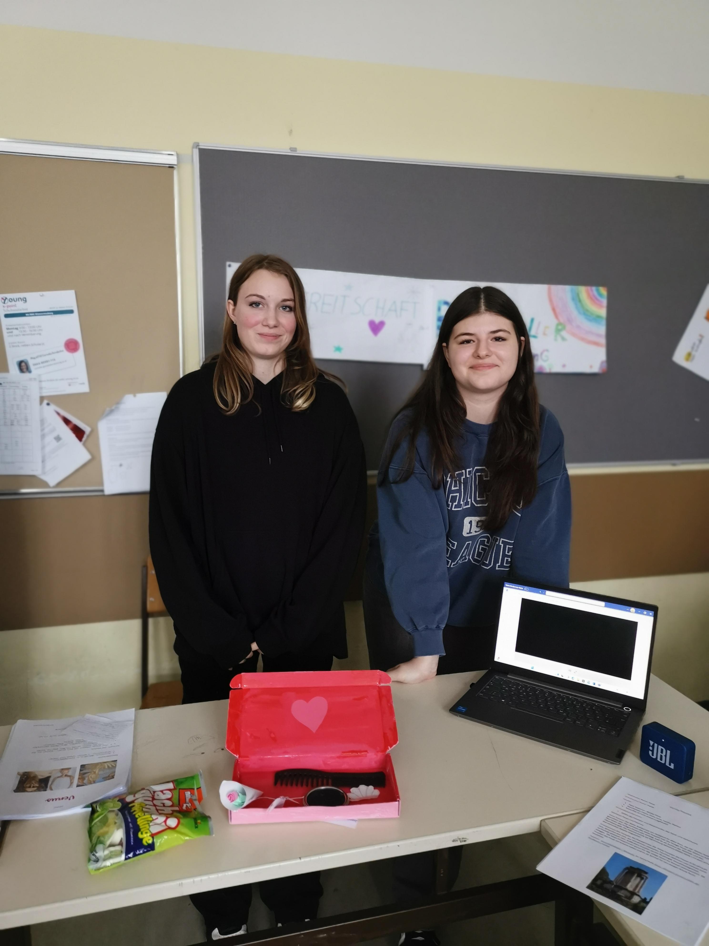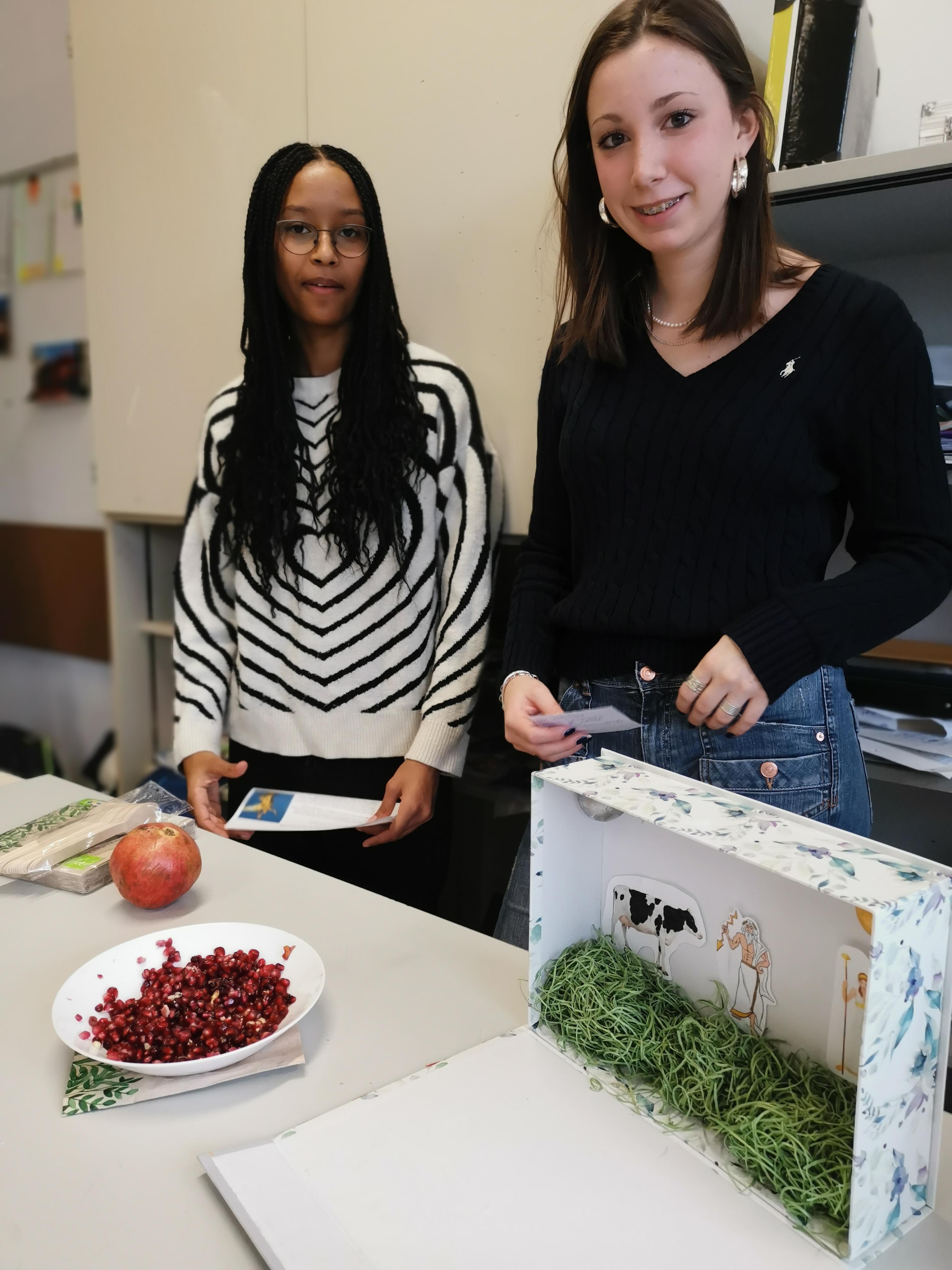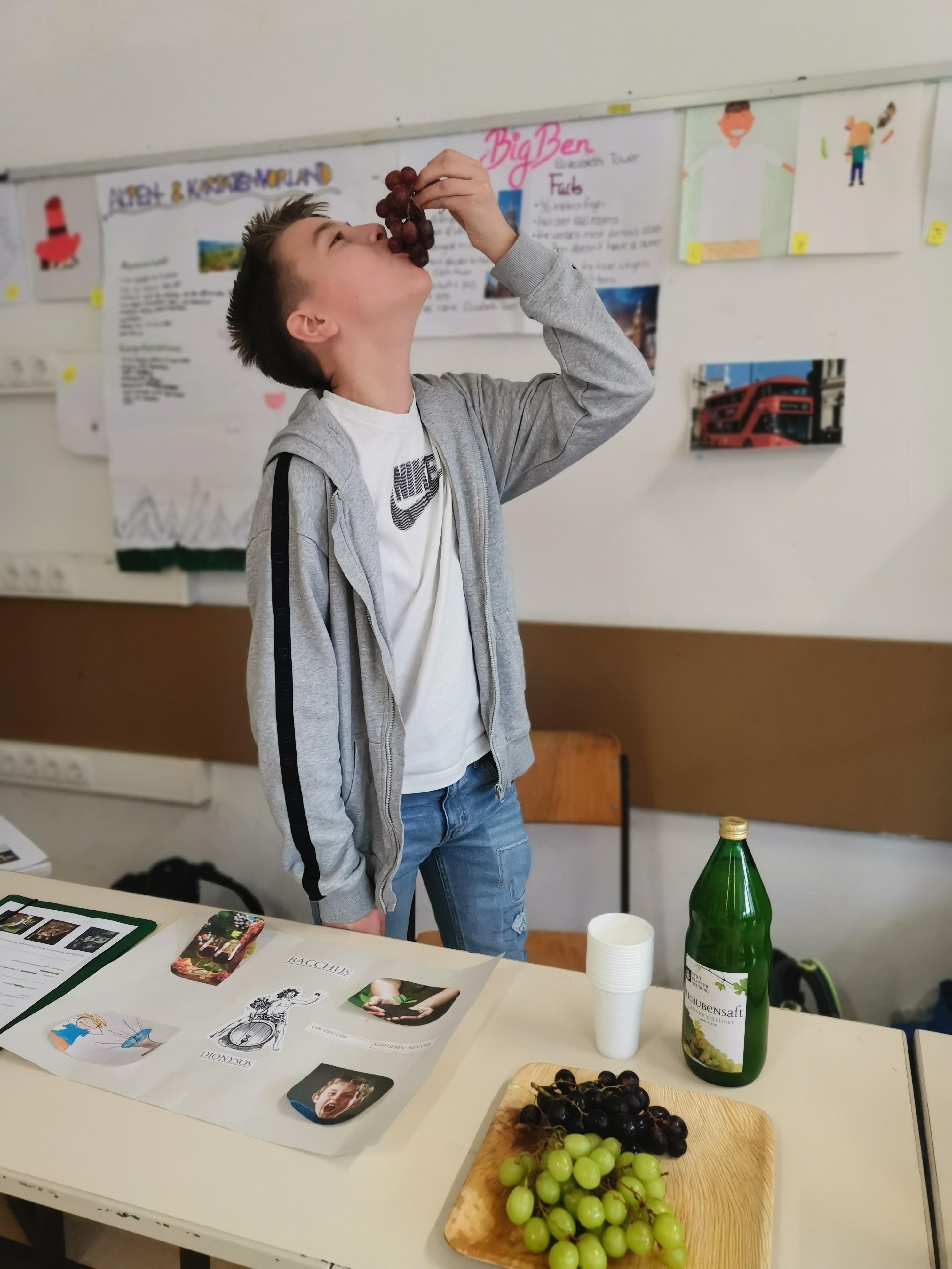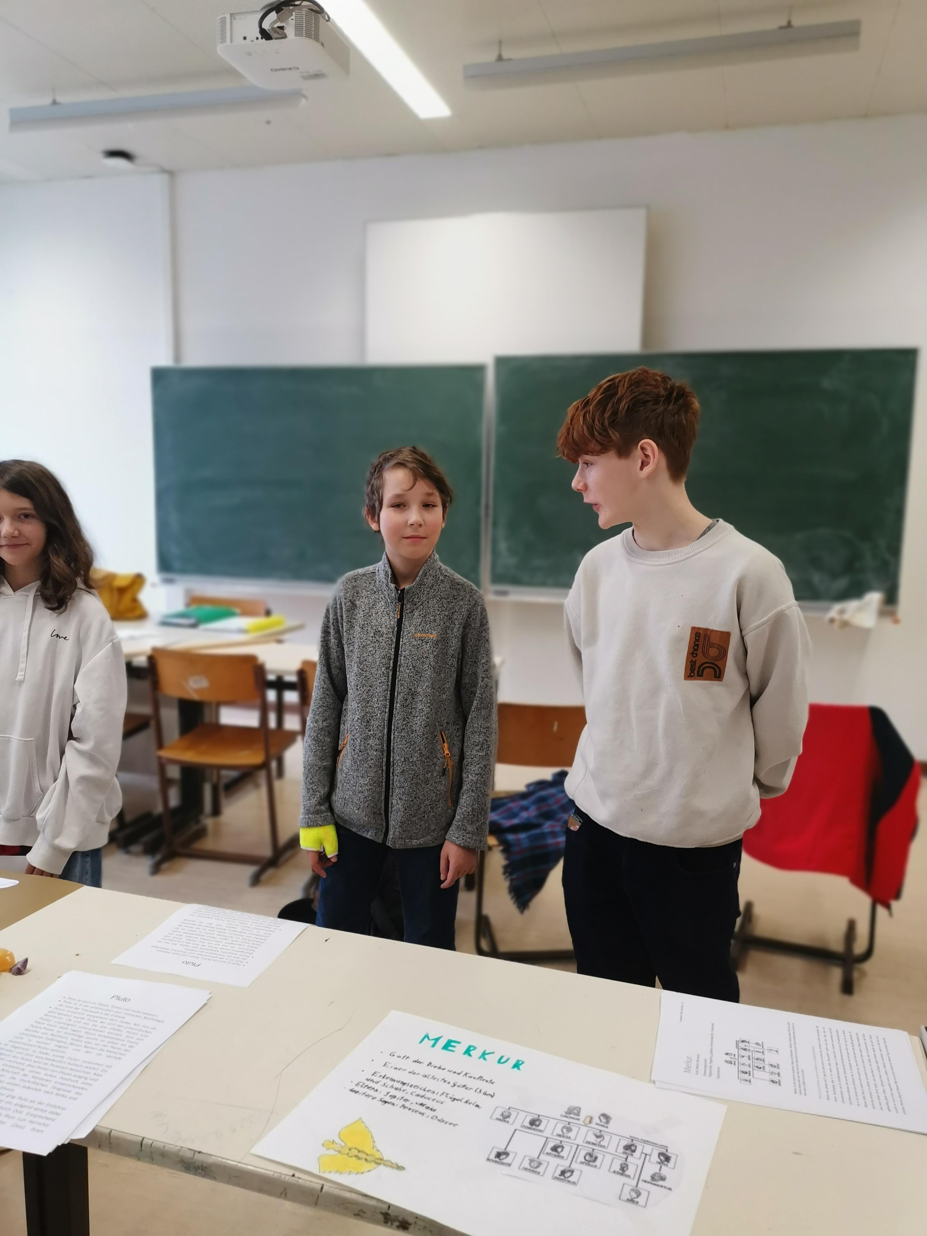 In Partnerarbeit haben sie einen Museumsbesuch der anderen/antiken Artvorbereitet. Ein sehr wichtiger Teil der Präsentation war ein Artefakt zur Gottheit, das herzustellen für alle wohl am lustigsten war. Da gab es nun beflügelnde Schuhe des Hermes/Merkur, einen riesigen Aesculap-Stab mit Schlange, ein beeindruckendes Dionysos/Bacchus-Flaschen-Etikett und Weintrauben, Poseidons/Neptuns Dreizack, einen wunderschönen Tempel, Apollos Lyra, Hammer und Amboss des Hephaistos/Vulcanus, ein Hirsch-Geweih, das Aktaion (Opfer der Artemis/Diana) symbolisiert, jede Menge Herzen der Aphrodite/Venus, einen Webstuhl der Minerva und viele weitere tolle Kunstwerke. Außerdem wollte Neptun/Poseidon unbedingt on stage!