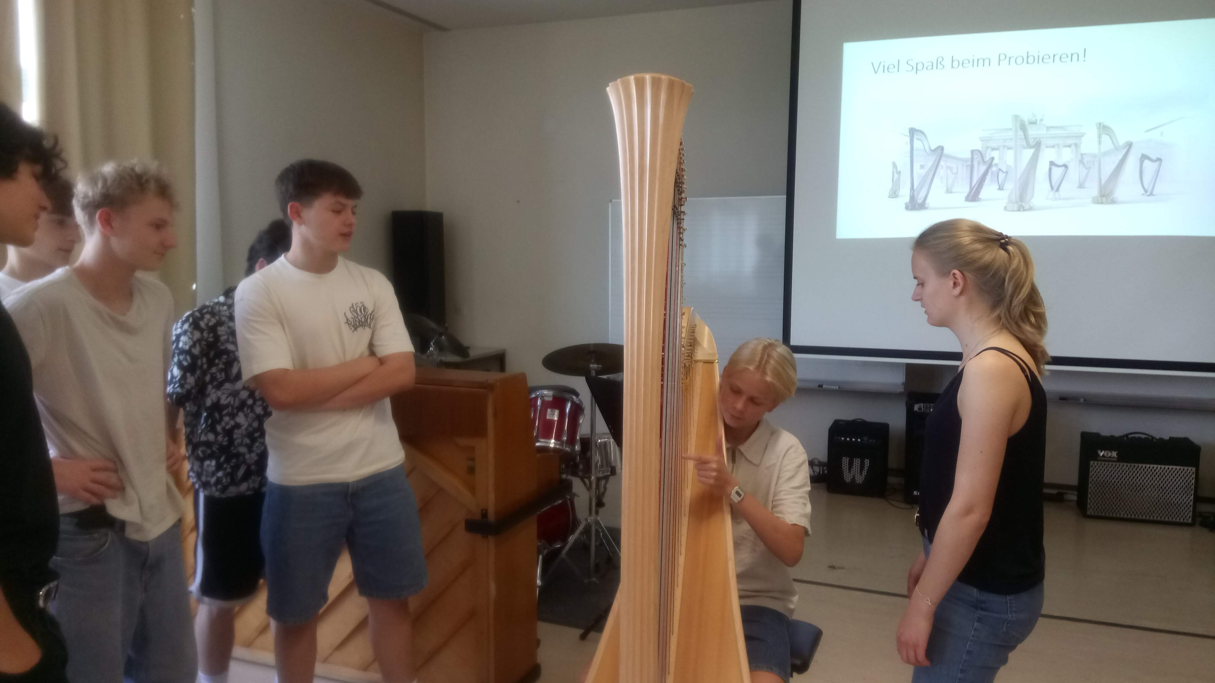 Im Juni wurde an unserer Schule ein ganzer Tag dem Instrument Harfe gewidmet. Die ehemalige Schülerin Agnes Müller, jetzt Harfelehrerin, kam mit ihren Harfen an die Schule und stellte ihr wunderbares Instrument insgesamt zehn Klassen vor. Emilia Schanda aus der 6B, eine Schülerin von Agnes, unterstützte sie dabei tatkräftig. Neben Informationen zum Instrumentenbau und der Verwendung in verschiedenen Musikstilen bekamen die teilnehmenden SchülerInnen auch einige Konzertstücke auf höchstem Niveau vorgespielt. Zum Abschluss konnte man die Harfen sogar noch selbst ausprobieren. Die Schüler und Schülerinnen waren begeistert.