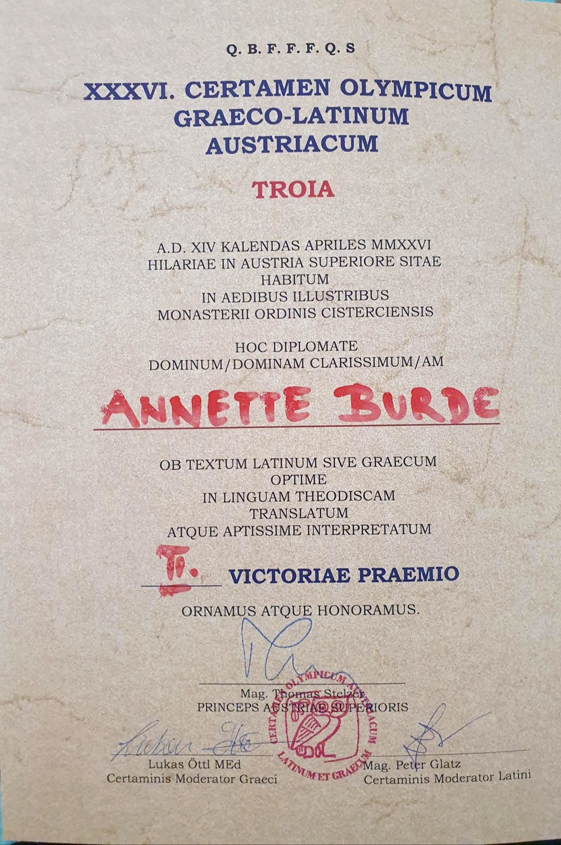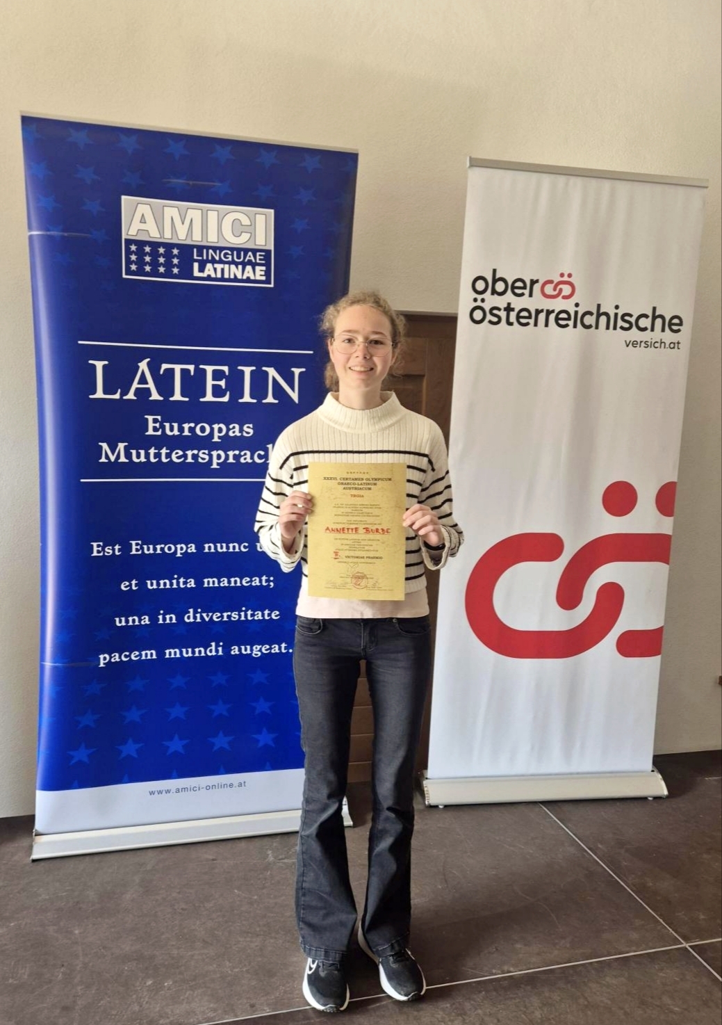 Annette Burde hat im Fremdsprachenwettbewerb in der Sprache LATEIN nicht nur den 1. Platz in Niederösterreich belegt, sondern darf sich nun nach ihrer Teilnahme am Bundeswettbewerb österreichweit als zweitbeste Latein-Schülerin (4jähriges Latein) bezeichnen!