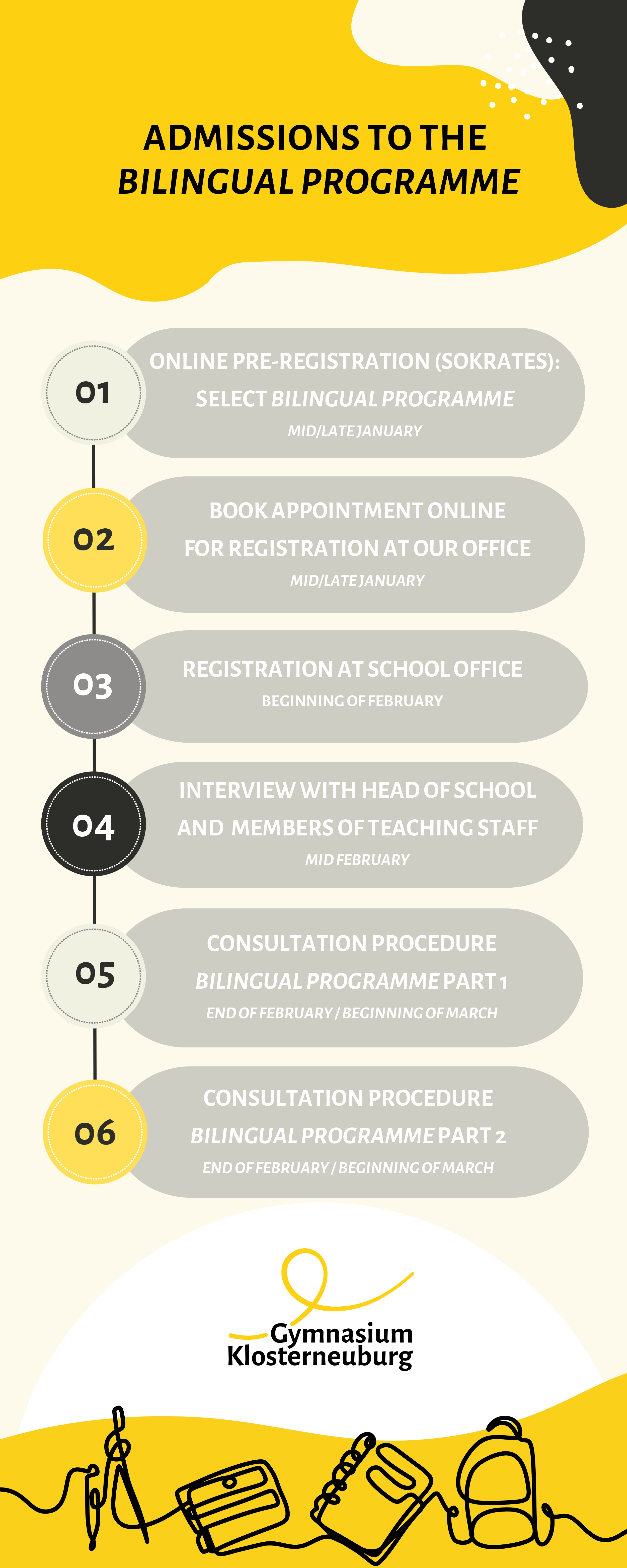 In mid/late January, you will find links on our school homepage for online pre-registration on Sokrates (please select "Interesse am Bilingual Programme" on this form) and for online appointment booking for registration at the school office. Once you have registered your child at the school office, interviews with the head of school and members of our teaching staff will take place in mid-February for all new pupils.To ensure that your child is well suited to our bilingual programme, a further (two-part) consultation procedure is then necessary.