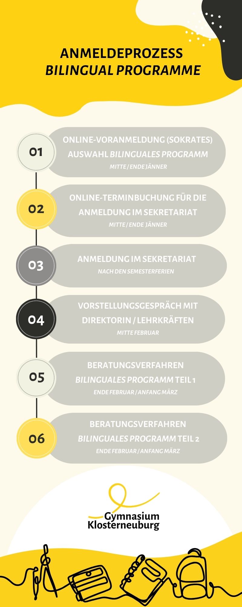 Mitte / Ende Jänner finden Sie auf der Startseite unserer Schulhomepage Links für die Online-Voranmeldung auf Sokrates (in diesem Formular bitte die Auswahl „Interesse am Bilingual Programme“ treffen) sowie für die Online-Terminbuchung zur Anmeldung im Sekretariat. Nachdem Sie sodann Ihr Kind im Sekretariat angemeldet haben, finden Mitte Februar für alle neuen Schüler:innen Vorstellungsgespräche mit der Direktorin bzw. Mitgliedern unseres Lehrkörpers statt.