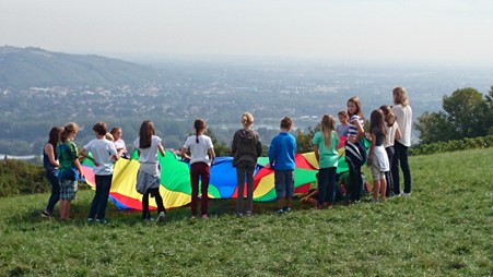 Alle Jahre wieder im September, wandern alle ersten Klassen gemeinsam auf den Buchberg, um den jährlichen Aktionstag zu bestreiten. Geschicklichkeits- und Gemeinschaftsspiele stehen auf der Tagesordnung. So wird der Klassenzusammenhalt gestärkt und man kann uns Mediatoren besser kennenlernen. Als kleine Stärkung zwischen den Stationen gibt es für alle Schüler je einen Muffin.